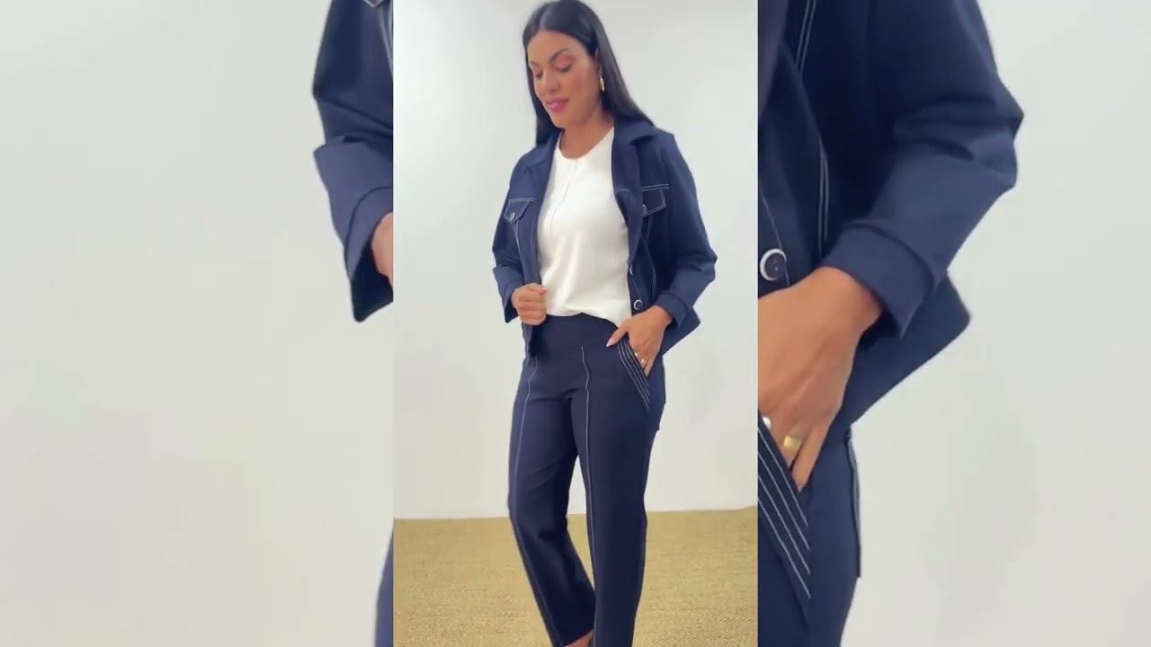A Calça Roberta é confeccionada em malha encorpada de alta qualidade, oferecendo excelente caimento e conforto ao vestir. Com modelagem reta, ela valoriza a silhueta sem marcar, proporcionando uma aparência sofisticada e moderna. Sua cor marinho é neutra e sofisticada permite combinações com tons claros, vibrantes ou terrosos, sendo uma excelente alternativa pra quem quer sair do preto. A peça conta com cintura alta e cós anatômico que se ajusta perfeitamente ao corpo, garantindo firmeza e sustentação ao longo do uso. Na parte frontal, apresenta recortes verticais com pesponto contrastante que alongam visualmente as pernas e conferem um toque contemporâneo ao design. O pesponto branco é o grande destaque desta calça: presente ao longo das costuras, bolsos e recortes, ele adiciona um toque de estilo e diferenciação ao visual, reforçando o estilo alfaiataria com um acabamento refinado. Ideal para composições sociais ou casuais elegantes. Os bolsos frontais são discretos e funcionais, com acabamento em costura contrastante que acompanha o visual moderno da peça. Na parte de trás, dois bolsos aplicados com o mesmo detalhe em pesponto branco conferem charme e equilíbrio ao design. A malha utilizada na confecção é estruturada, com toque macio, leve elasticidade e excelente sustentação — características que asseguram durabilidade, conforto térmico e liberdade de movimento. A peça tem acabamento limpo e sofisticado, com costuras reforçadas e barra reta.