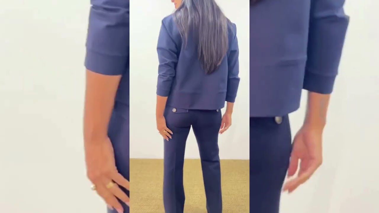 A Jaqueta é confeccionada em malha encorpada, possui modelagem reta, gola com colarinho, mangas longas, bolsos frontais com lapelas, fechamento frontal por botões, detalhes de pence e acabamento pespontado.